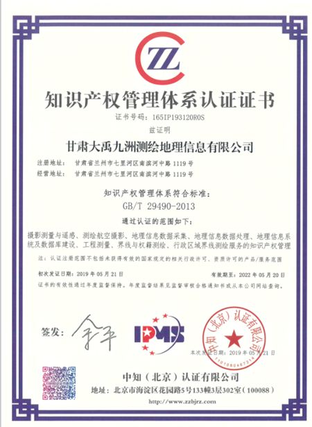 5月21日,甘肅大禹九洲測繪地理信息有限公司順利通過《企業(yè)知識產(chǎn)權管理規(guī)范》國家標準審核認證,并獲得該管理體系認證證書。